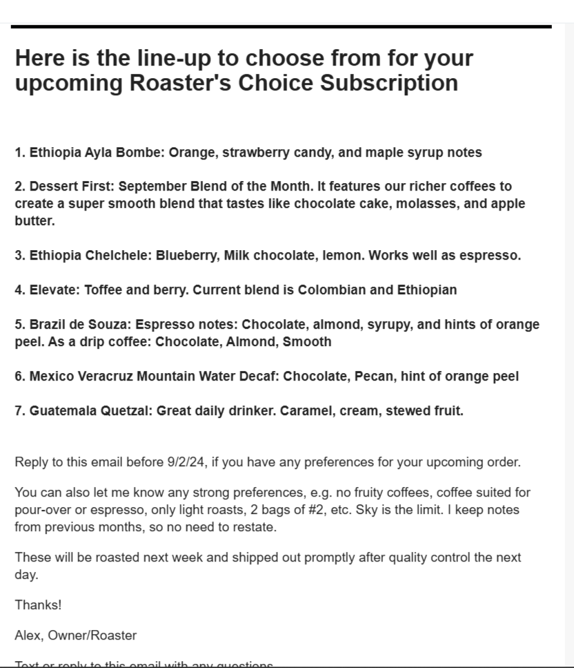 Our Ultimate Coffee Experience is the best way to experience all that we have to offer. Each month, we send out a list of ~6 coffees to choose from, including decaf. Most people want us to choose for them, but this is a good time to state any preferences. Then we carefully roast these coffees and ship them out the first week of each month.